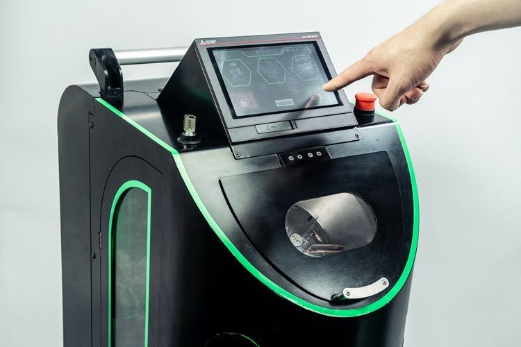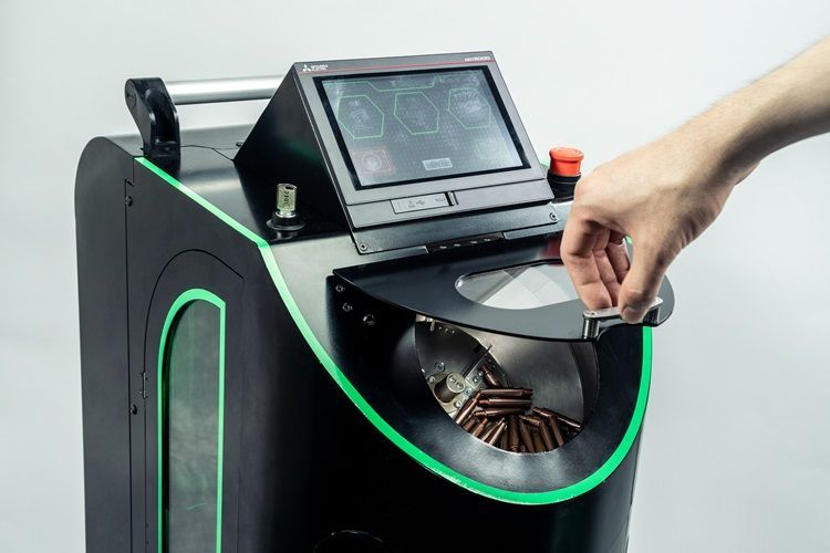 The machine ejects renewed tips from a drawer below the machine body. If, for any reason, a tip is rejected due to an error, the rejected tips are automatically sorted and ejected into a separate compartment.
