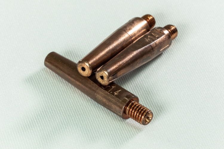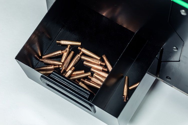 Contact tips that are renewed by this machine feature a newly formed triangular hole at the top of the contact tip.